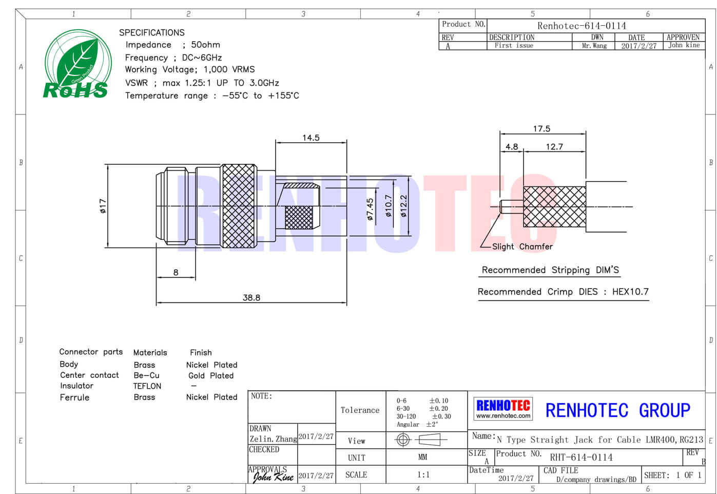 - n连接器,同轴线缆,母头,50欧,直式,压接,LMR400,RG213;