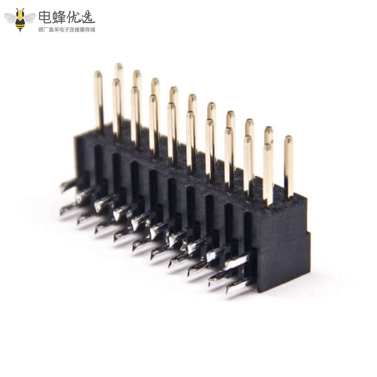- 排针连接器,公头,弯式,90度,20Pin,2.54mm,双排,穿孔,焊接,镀金,黑色,H7.4mm,方形;