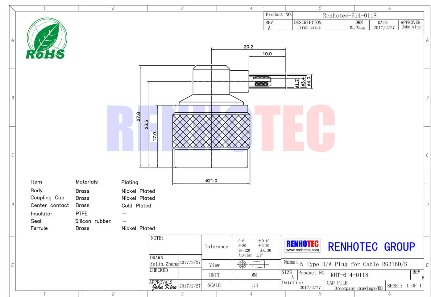 - n连接器,同轴线缆,公头,50欧,弯式,压接,RG316D/S;
