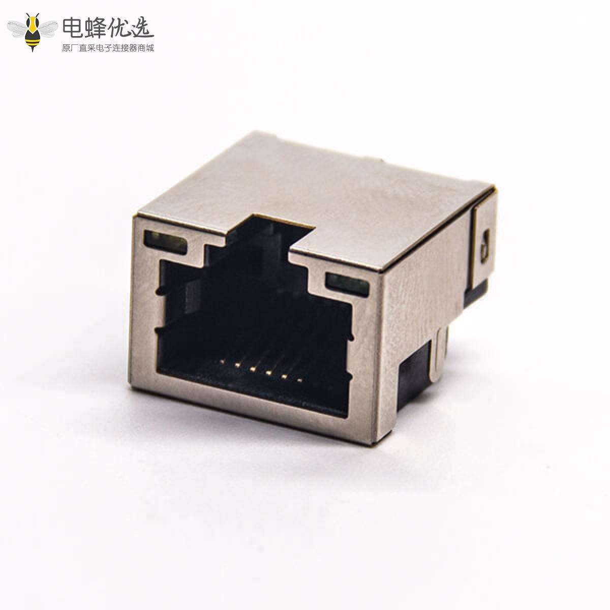 RJ45插座,8P8C,单端口,1*1,弯式90°,触头镀金,沉板贴板,PCB板安装,带屏蔽,带灯,不带滤波;