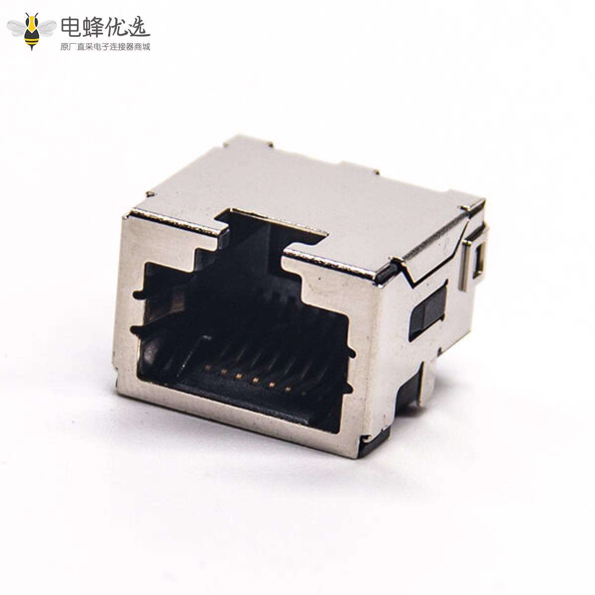 RJ45插座,8P8C,单端口,1*1,弯式90°,触头镀金,贴板,PCB板安装,带屏蔽,不带灯,不带滤波;