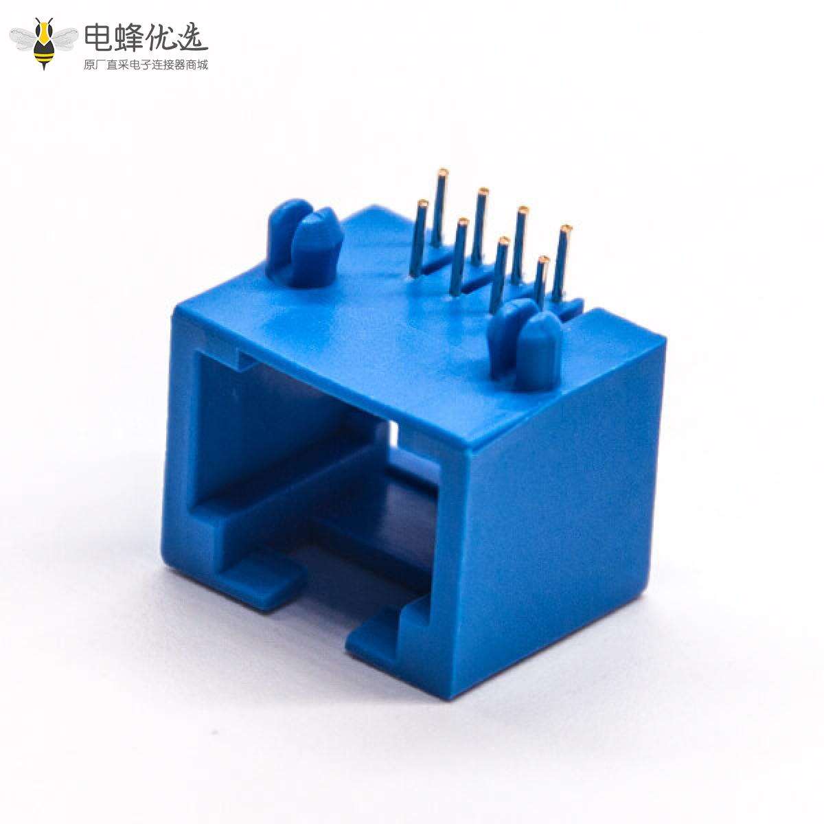 RJ45插座,8P8C,单端口,1*1,弯式90°,触头镀金,插板,PCB板安装,非屏蔽,不带灯,不带滤波;