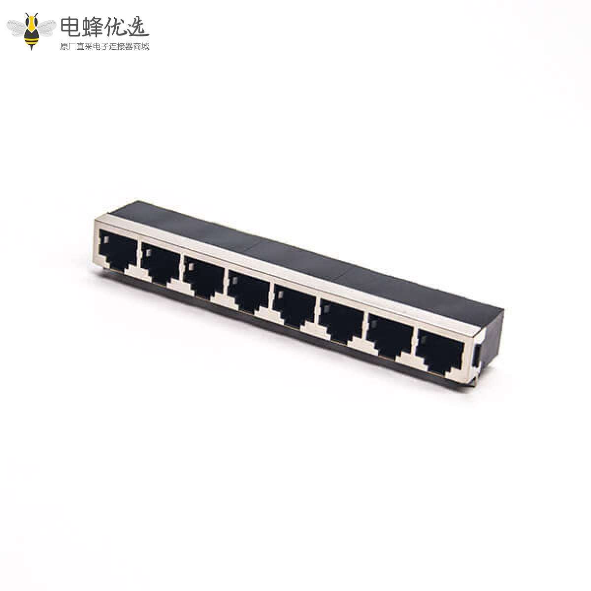 RJ45插座,8P8C,8端口,1*8,弯式90°,触头镀金,插孔,PCB板安装,带屏蔽,不带灯,不带滤波;