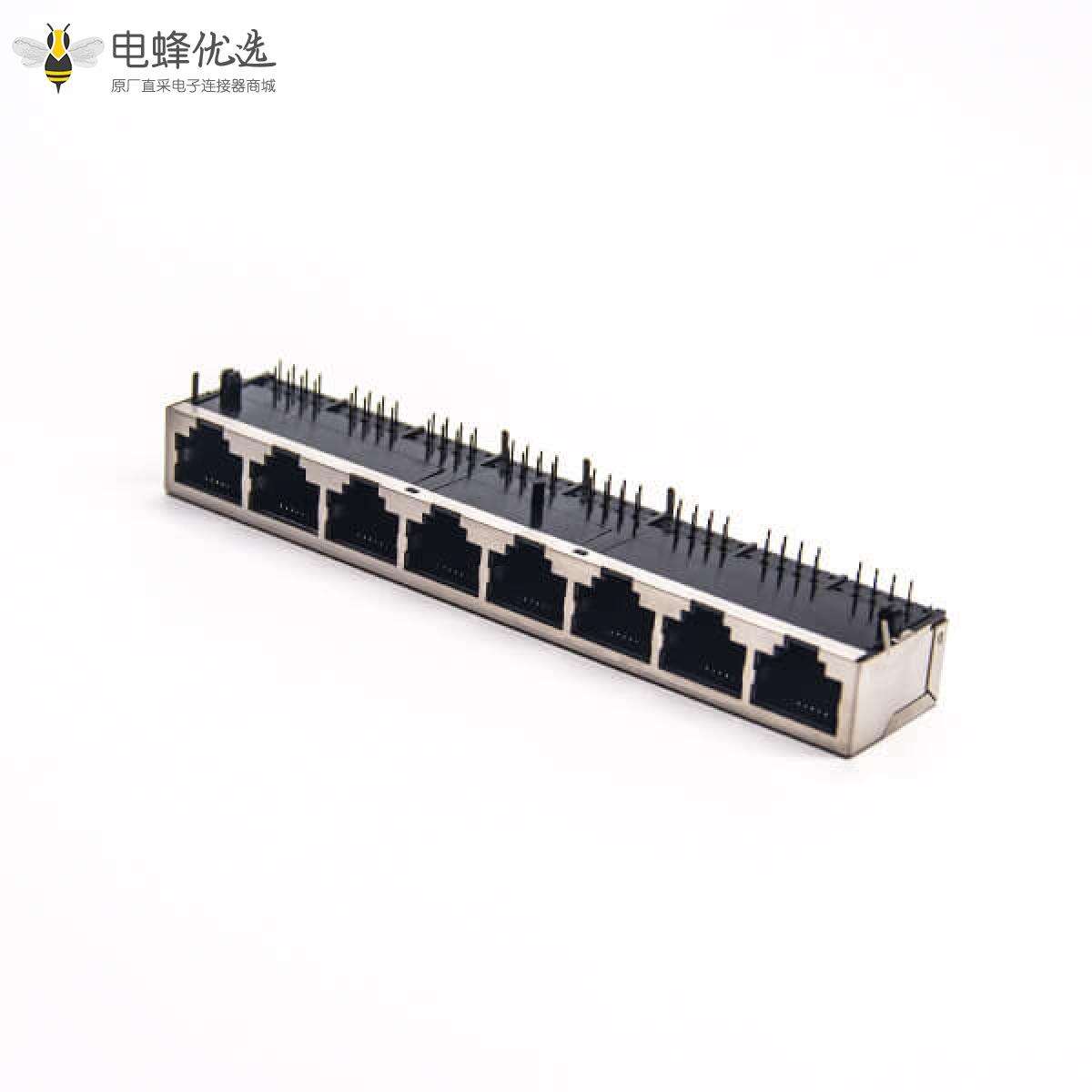 RJ45插座,8P8C,8端口,1*8,弯式90°,触头镀金,插孔,PCB板安装,带屏蔽,不带灯,不带滤波;