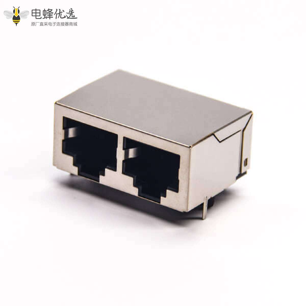 RJ45插座,8P8C,2端口,1*2,弯式90°,触头镀金,插孔,PCB板安装,带屏蔽,不带灯,不带滤波;