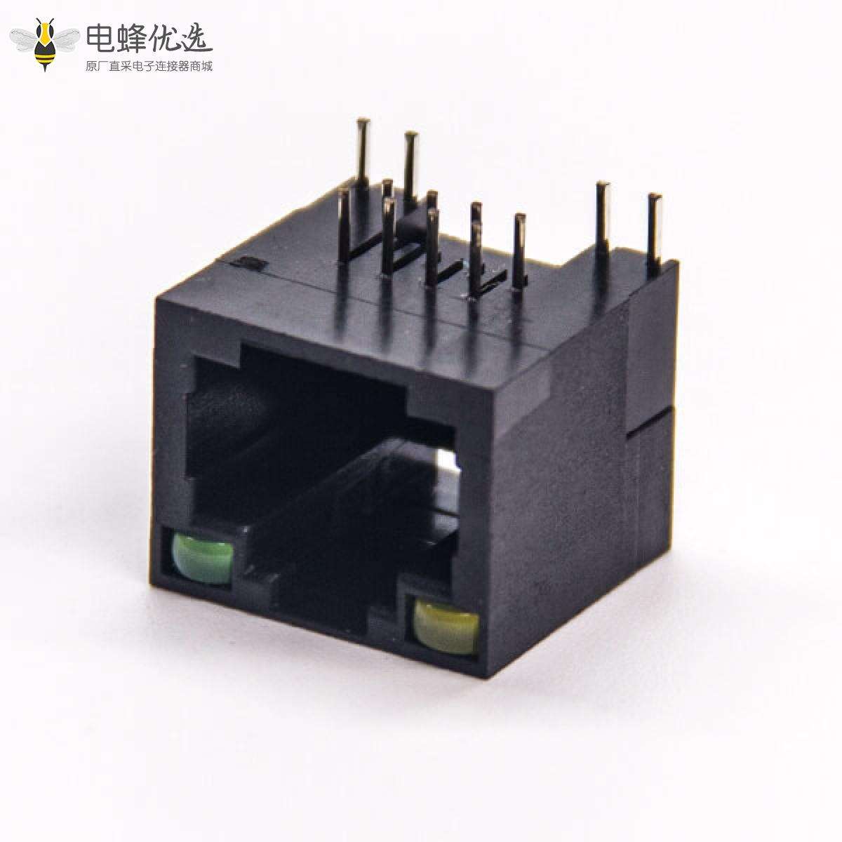 RJ45插座,8P8C,单端口,1*1,弯式90°,触头镀金,插孔,PCB板安装,非屏蔽,带灯,不带滤波;
