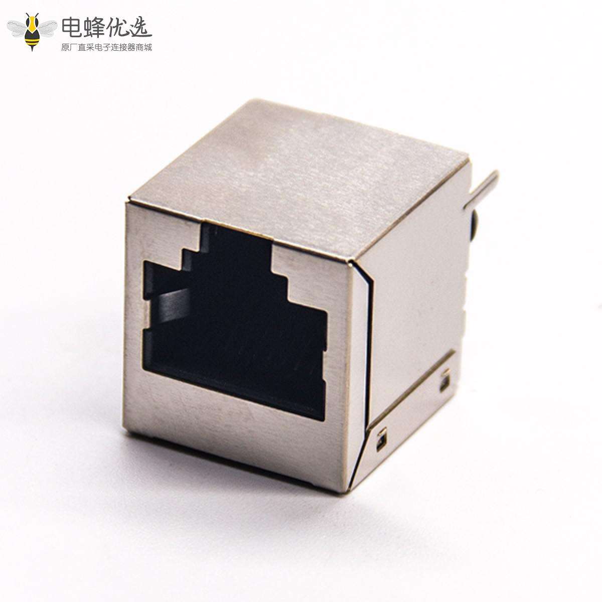 RJ45插座,8P8C,单端口,1*1,弯式45°,触头镀金,插孔,PCB板安装,带屏蔽,不带灯,不带滤波;