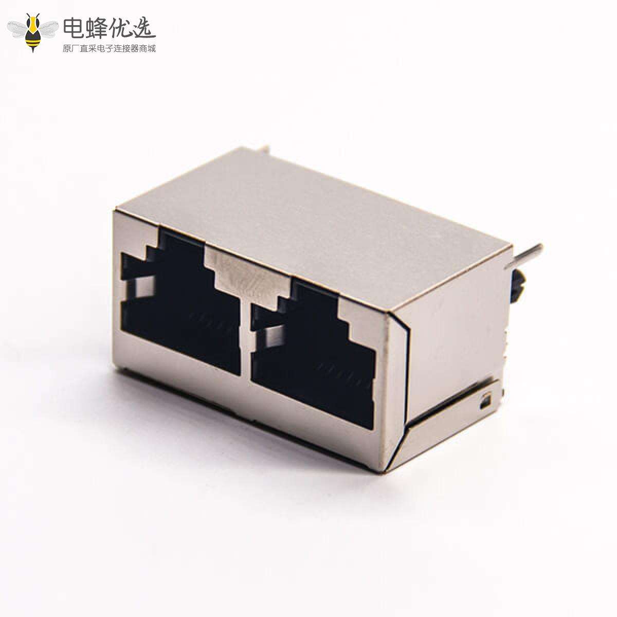 RJ45插座,8P8C,双端口,1*2,直式180°,触头镀金,插孔,PCB板安装,带屏蔽,不带灯,不带滤波;