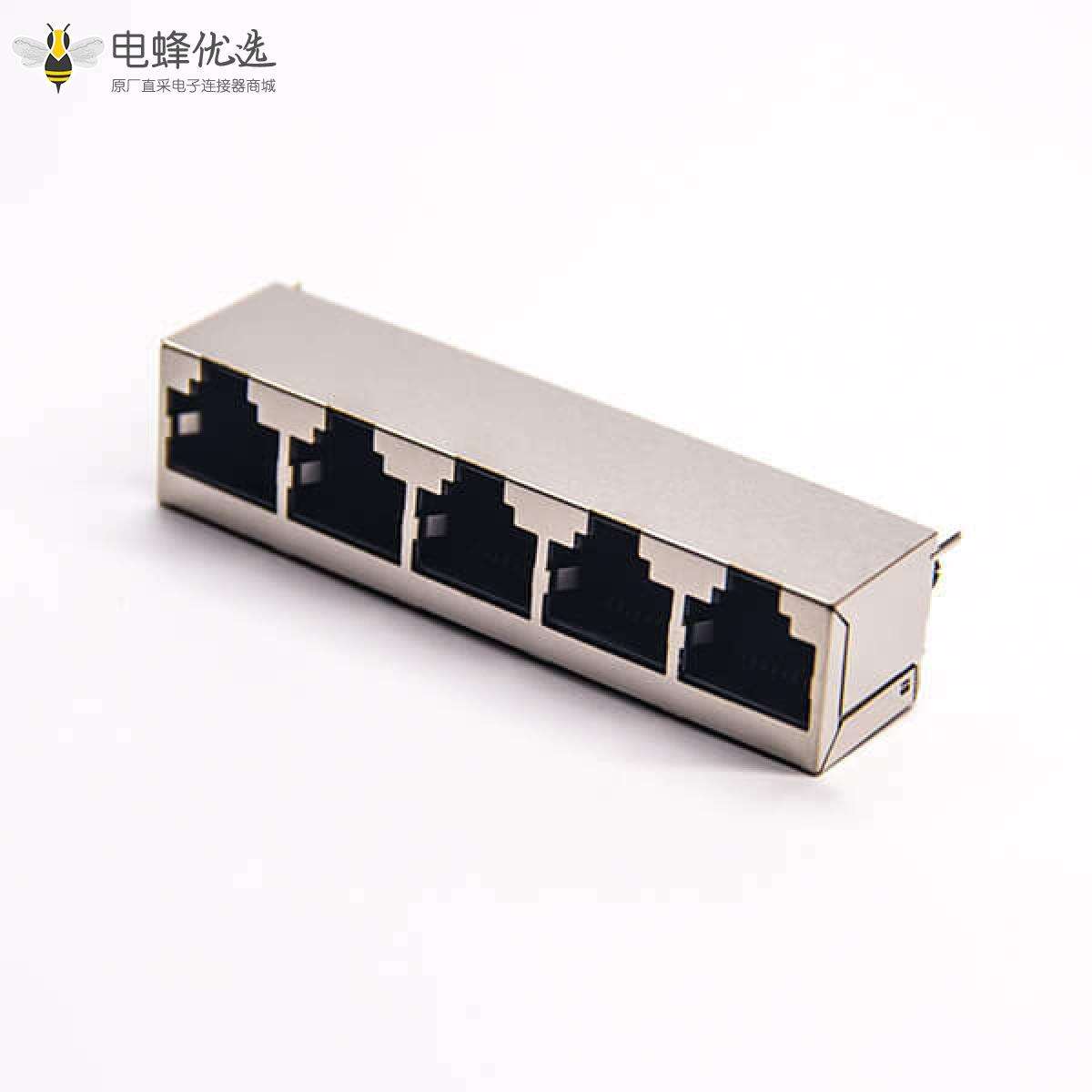 RJ45插座,8P8C,5端口,1*5,直式180°,触头镀金,插孔,PCB板安装,带屏蔽,不带灯,不带滤波;