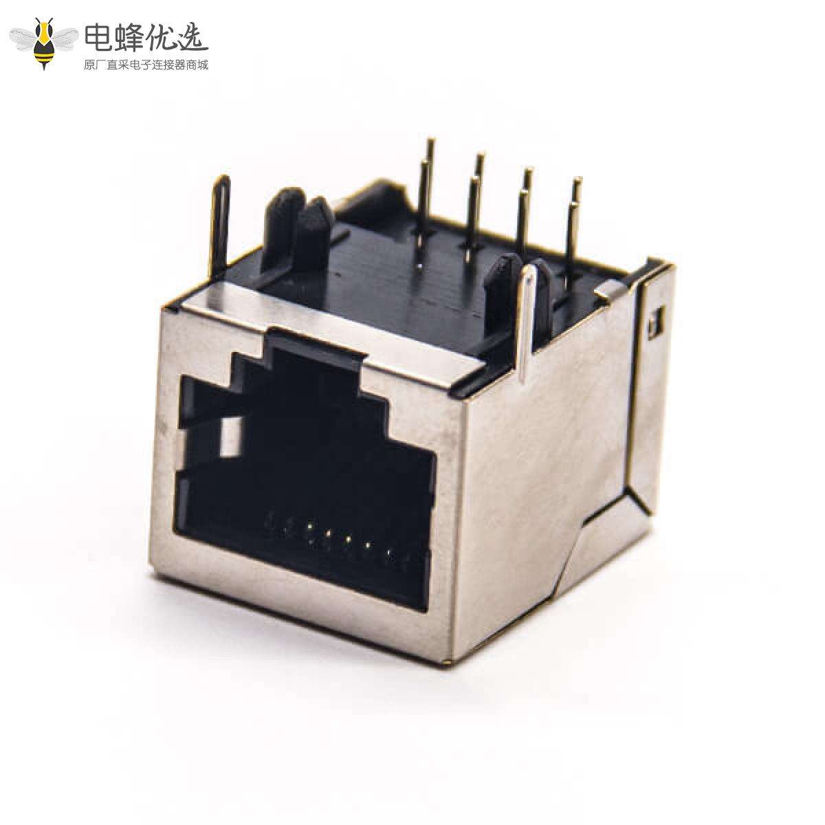 RJ45插座,8P8C,单端口,1*1,弯式90°,触头镀金,插孔,PCB板安装,带屏蔽,不带灯,不带滤波;