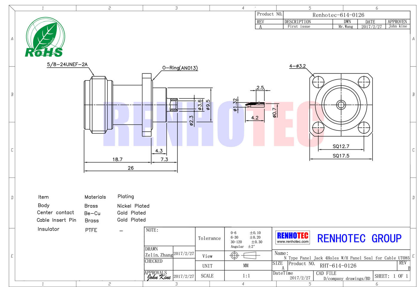 - n连接器,同轴线缆,母头,50欧,直式,4孔法兰,UT085 ,面板安装;