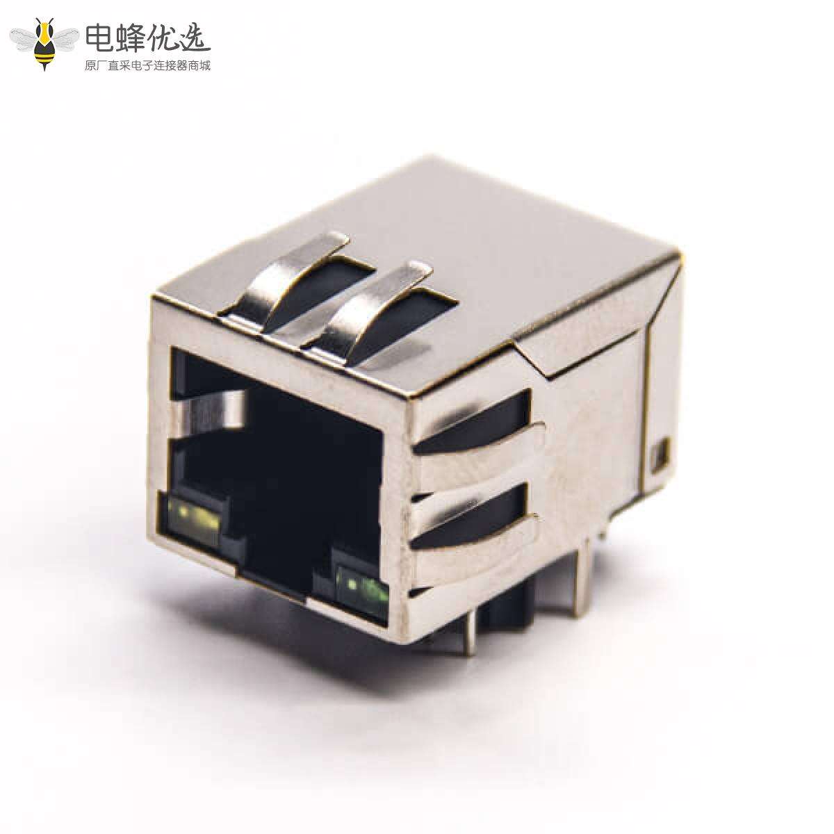 RJ45插座,8P8C,单端口,1*1,弯式90°,触头镀金,插孔,PCB板安装,带屏蔽,带灯,不带滤波;