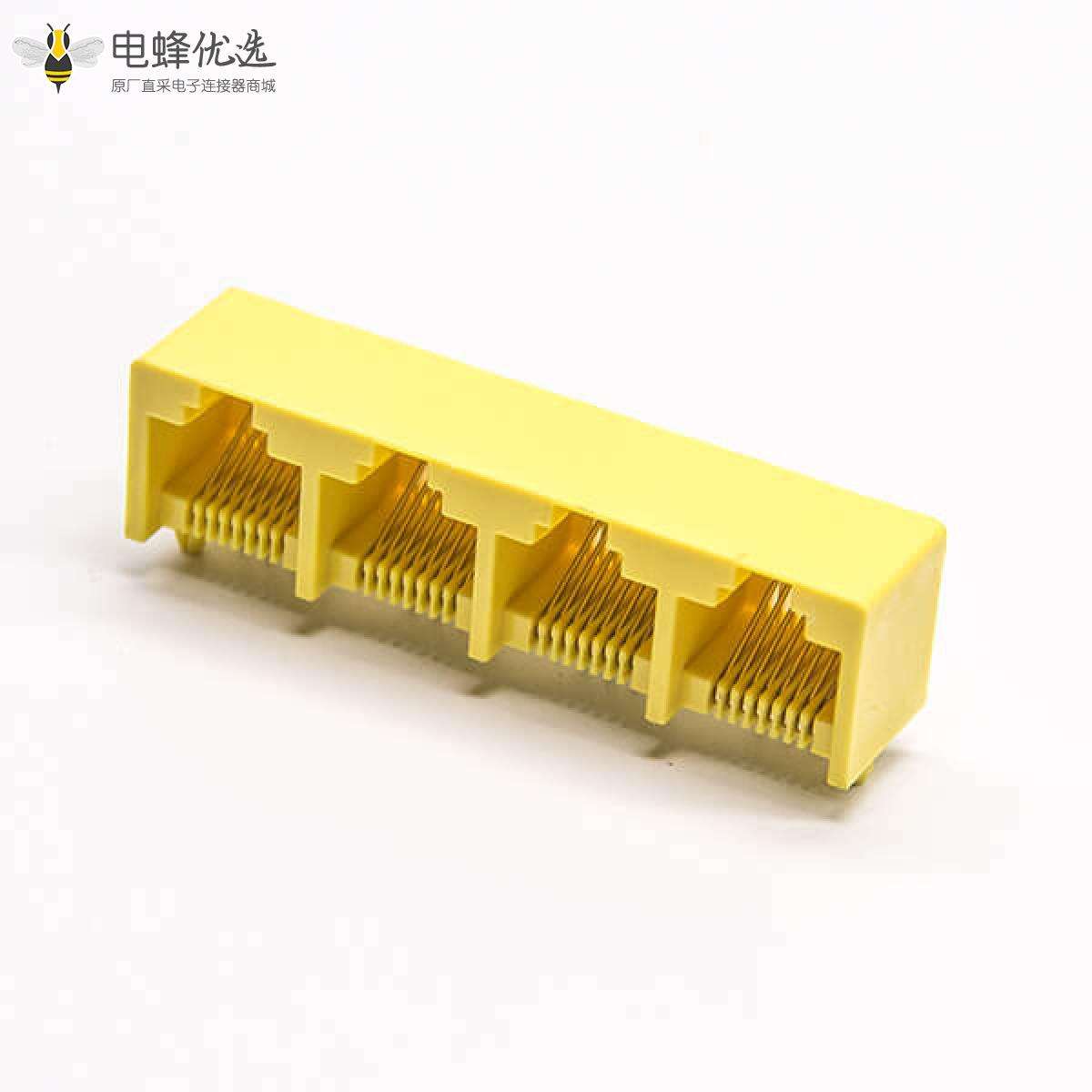 RJ45插座,8P8C,4端口,1*4,弯式90°,触头镀金,插孔,PCB板安装,非屏蔽,不带灯,不带滤波;
