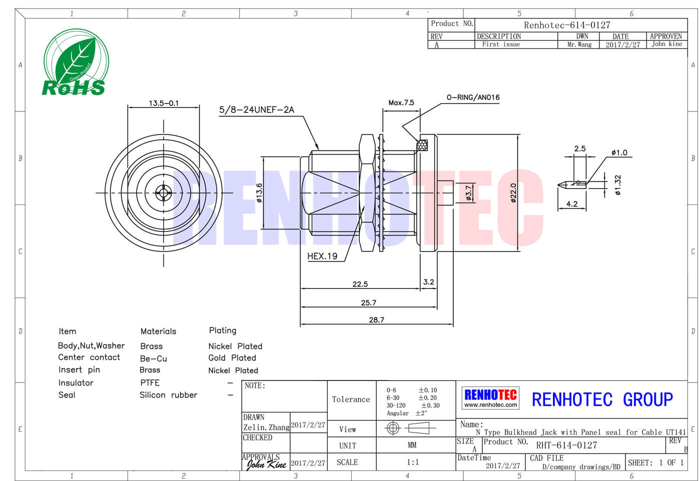 - n连接器,同轴线缆,母头,50欧,直式,穿墙,UT141 ,面板安装;