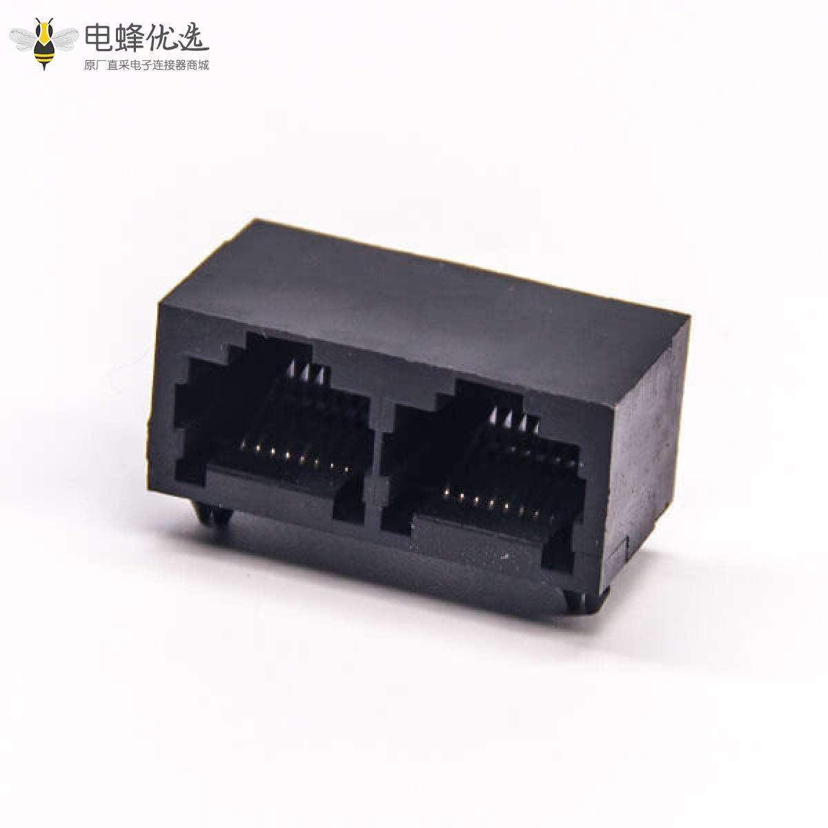 RJ45插座,8P8C,双端口,1*2,弯式90°,触头镀金,插孔,PCB板安装,非屏蔽,不带灯,不带滤波;