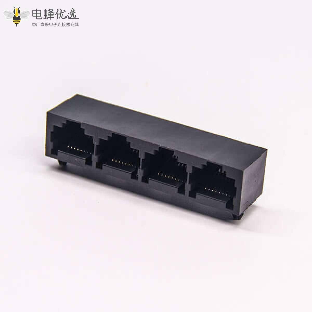 RJ45插座,8P8C,4端口,1*4,弯式90°,触头镀金,插孔,PCB板安装,非屏蔽,不带灯,不带滤波;