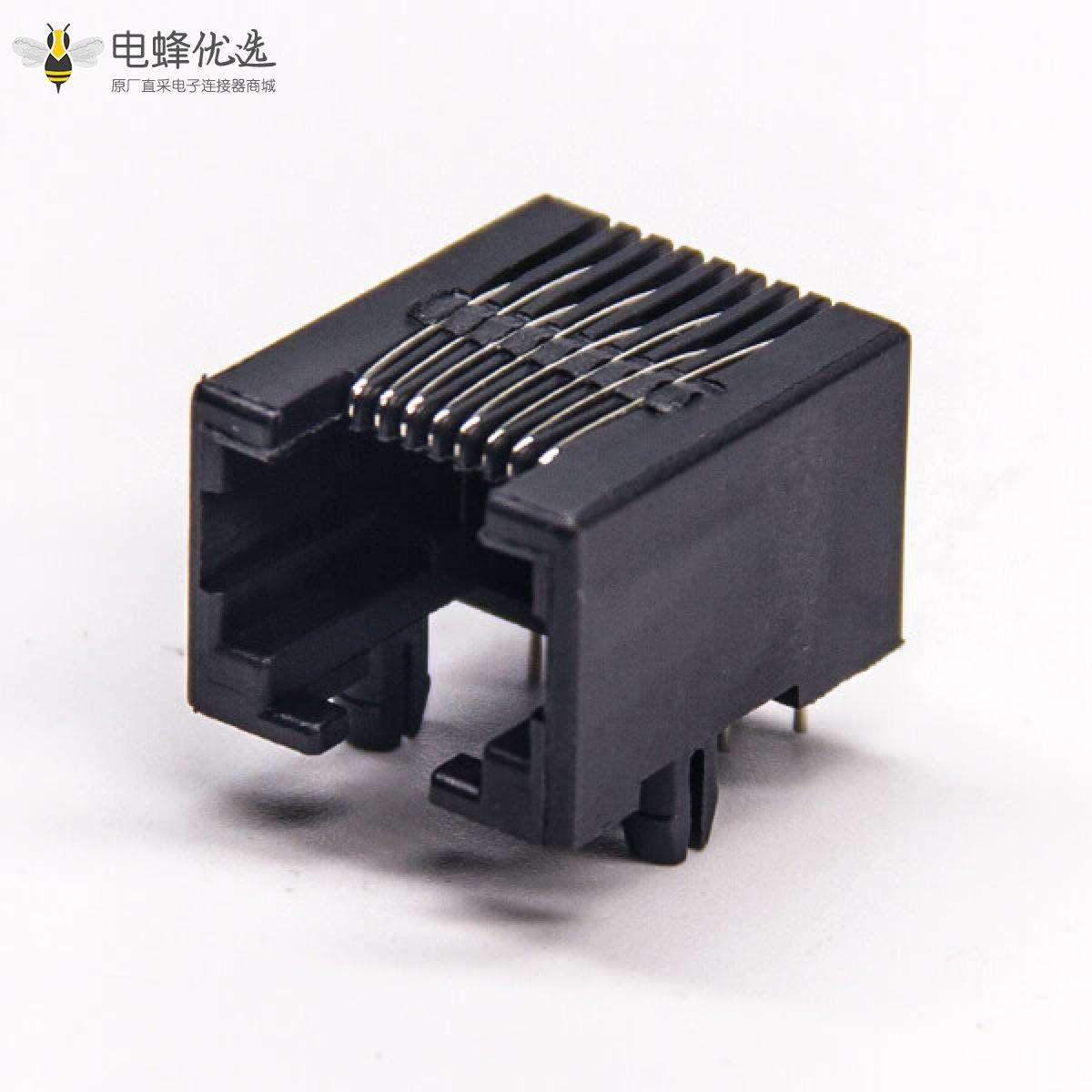 RJ45插座,8P8C,单端口,1*1,弯式90°,触头镀金,插孔,PCB板安装,非屏蔽,不带灯,不带滤波;