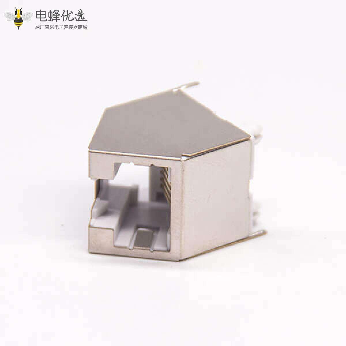 RJ45插座,8P8C,单端口,1*1,弯式45°,触头镀金,插孔,PCB板安装,带屏蔽,不带灯,不带滤波;