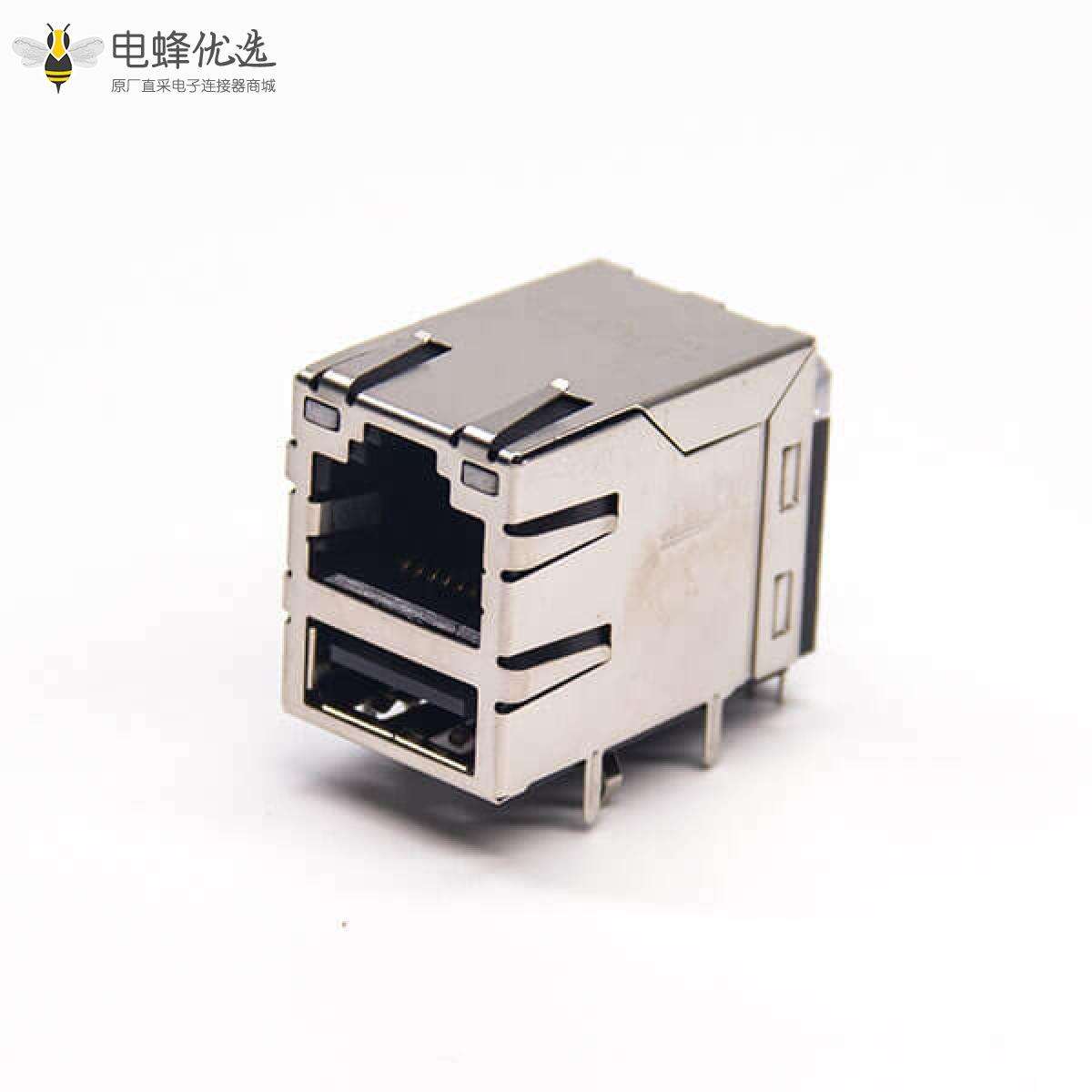 RJ45+Single USB,8P8C,2端口,2*1,弯式90°,触头镀金,插孔,PCB板安装,带屏蔽,带灯,不带滤波;
