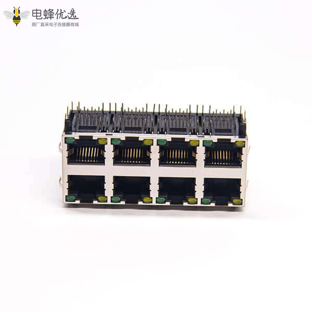 RJ45插座,8P8C,8端口,2*4,弯式90°,触头镀金,插孔,PCB板安装,带屏蔽,带灯,不带滤波;
