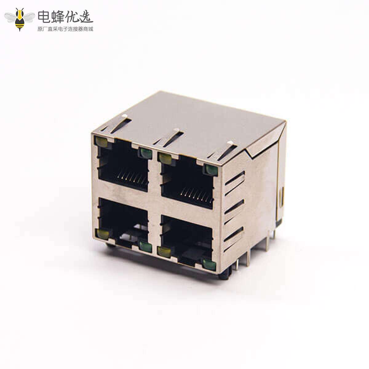 RJ45插座,8P8C,4端口,2*2,弯式90°,触头镀金,插孔,PCB板安装,带屏蔽,带灯,不带滤波,带弹片;