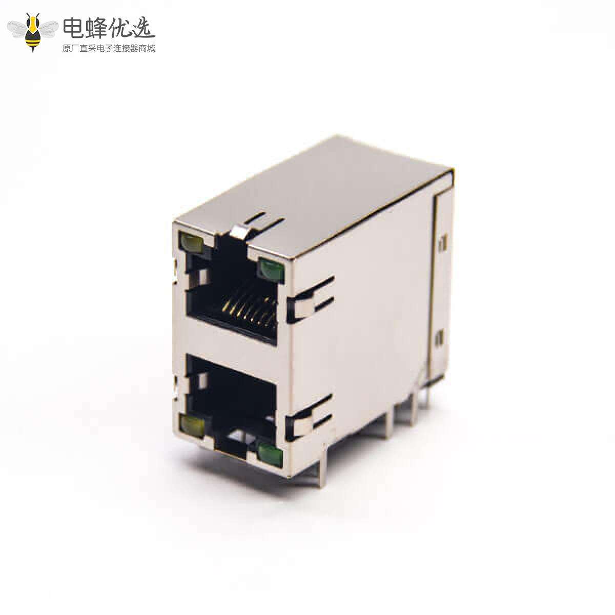 RJ45插座,8P8C,2端口,2*1,弯式90°,触头镀金,插孔,PCB板安装,带屏蔽,带灯,不带滤波;