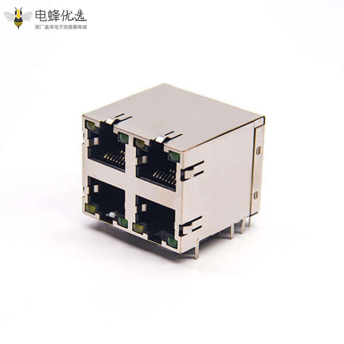 RJ45插座,8P8C,4端口,2*2,弯式90°,触头镀金,插孔,PCB板安装,带屏蔽,带灯,不带滤波;