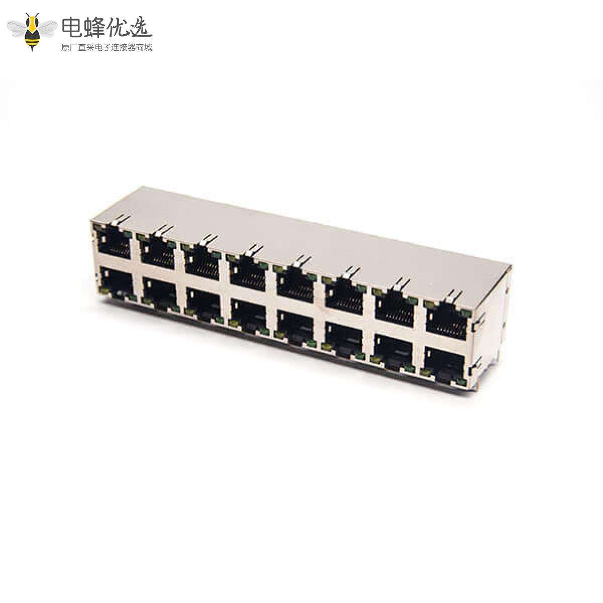 RJ45插座,8P8C,16端口,2*8,弯式90°,触头镀金,插孔,PCB板安装,带屏蔽,带灯,不带滤波;