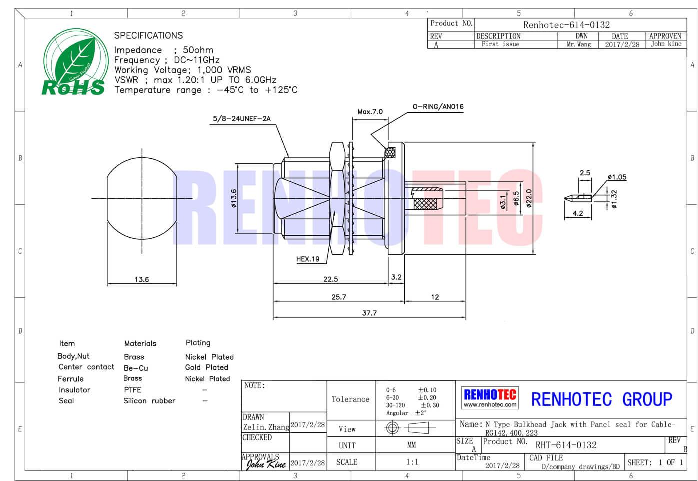 - 高性能连接器,频率范围达0到11GHz,阻抗50欧姆;