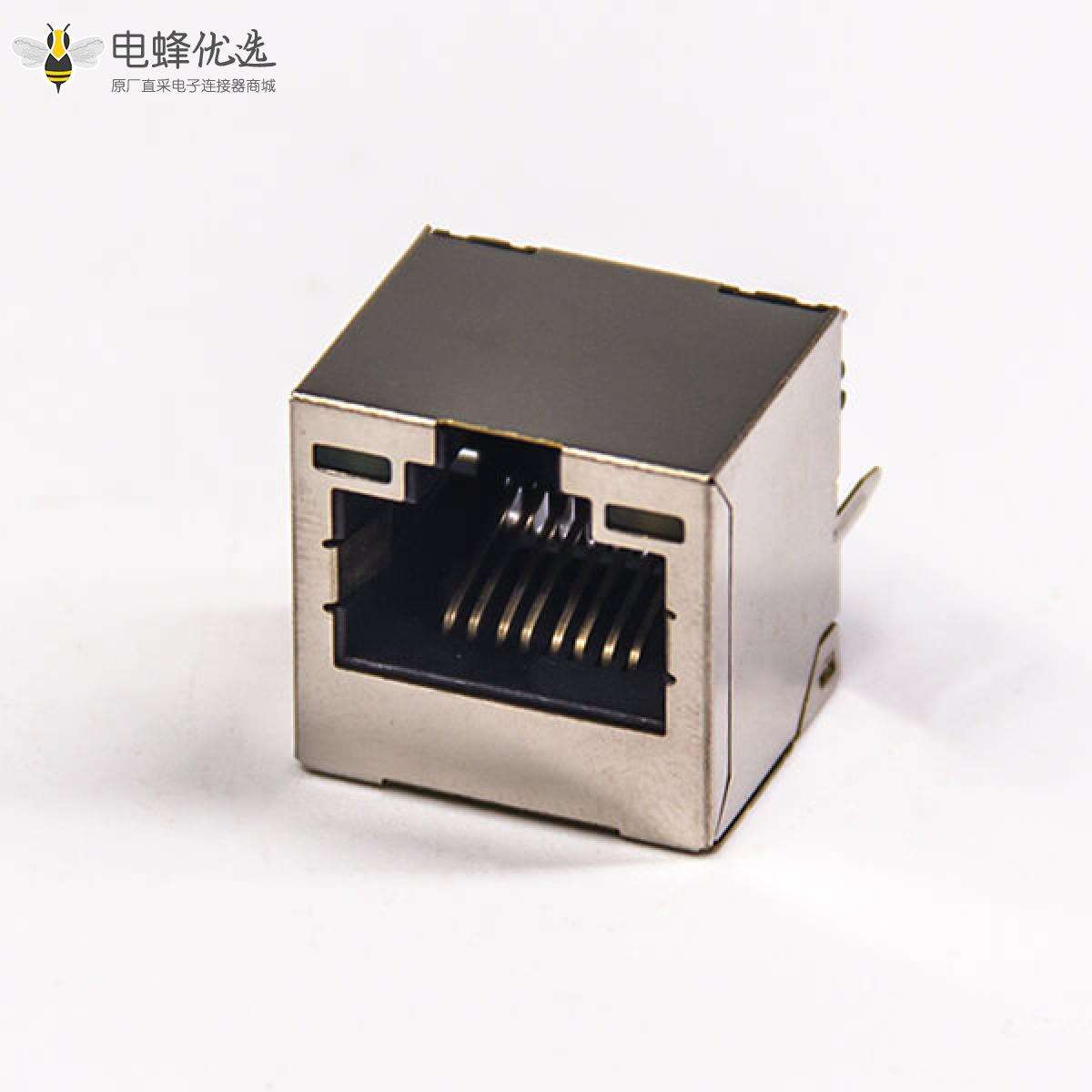 RJ45插座,8P8C,单端口,1*1,直式180°,触头镀金,插孔,PCB板安装,带屏蔽,带灯,不带滤波;