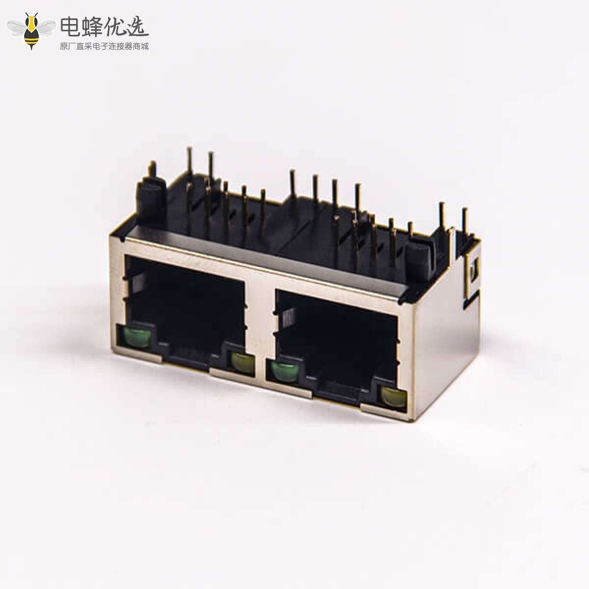 RJ45插座,8P8C,双端口,1*2,弯式90°,触头镀金,插板,PCB板安装,带屏蔽,带灯,不带滤波;