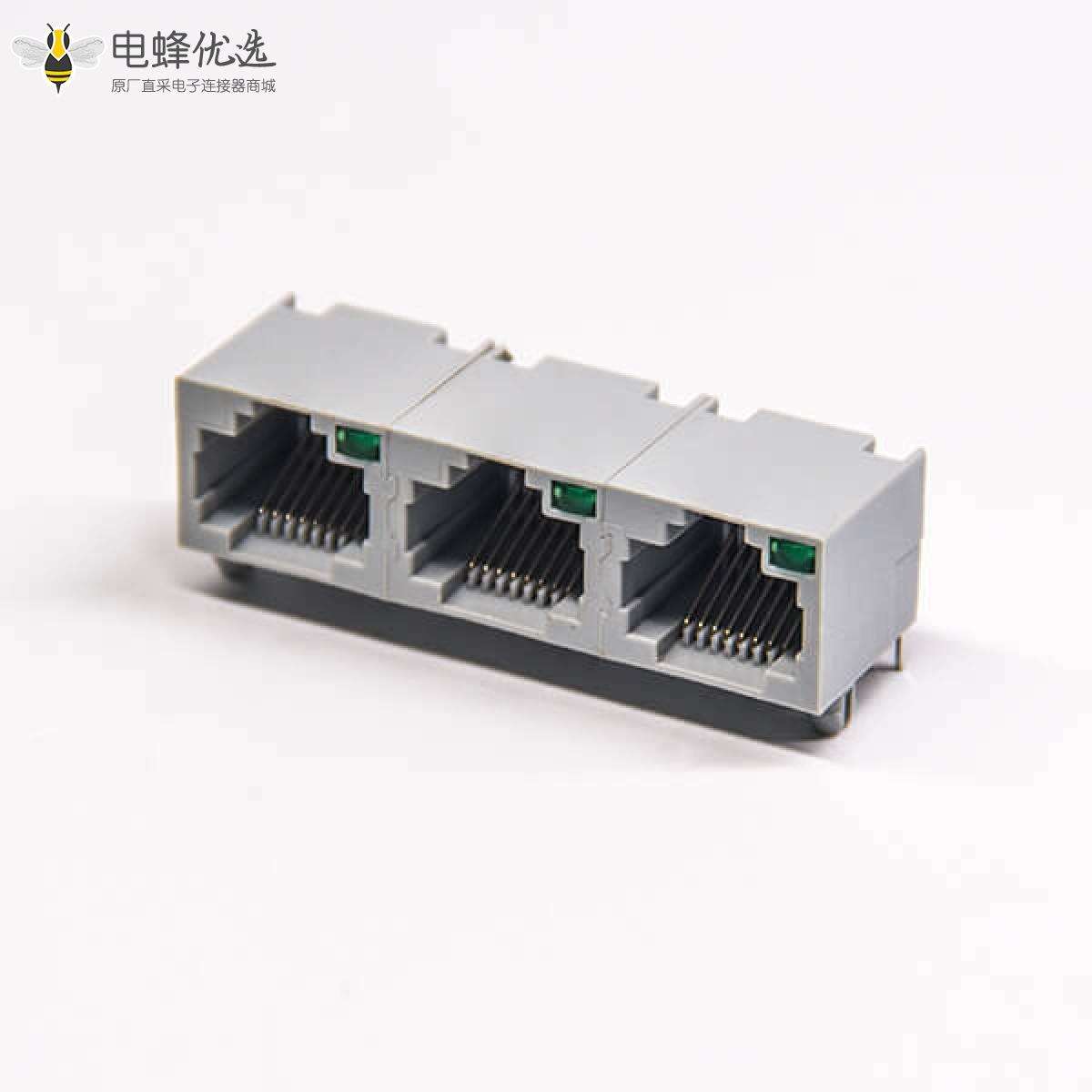 RJ45插座,8P8C,3端口,1*3,弯式90°,触头镀金,插板,PCB板安装,不带屏蔽,带灯,不带滤波;