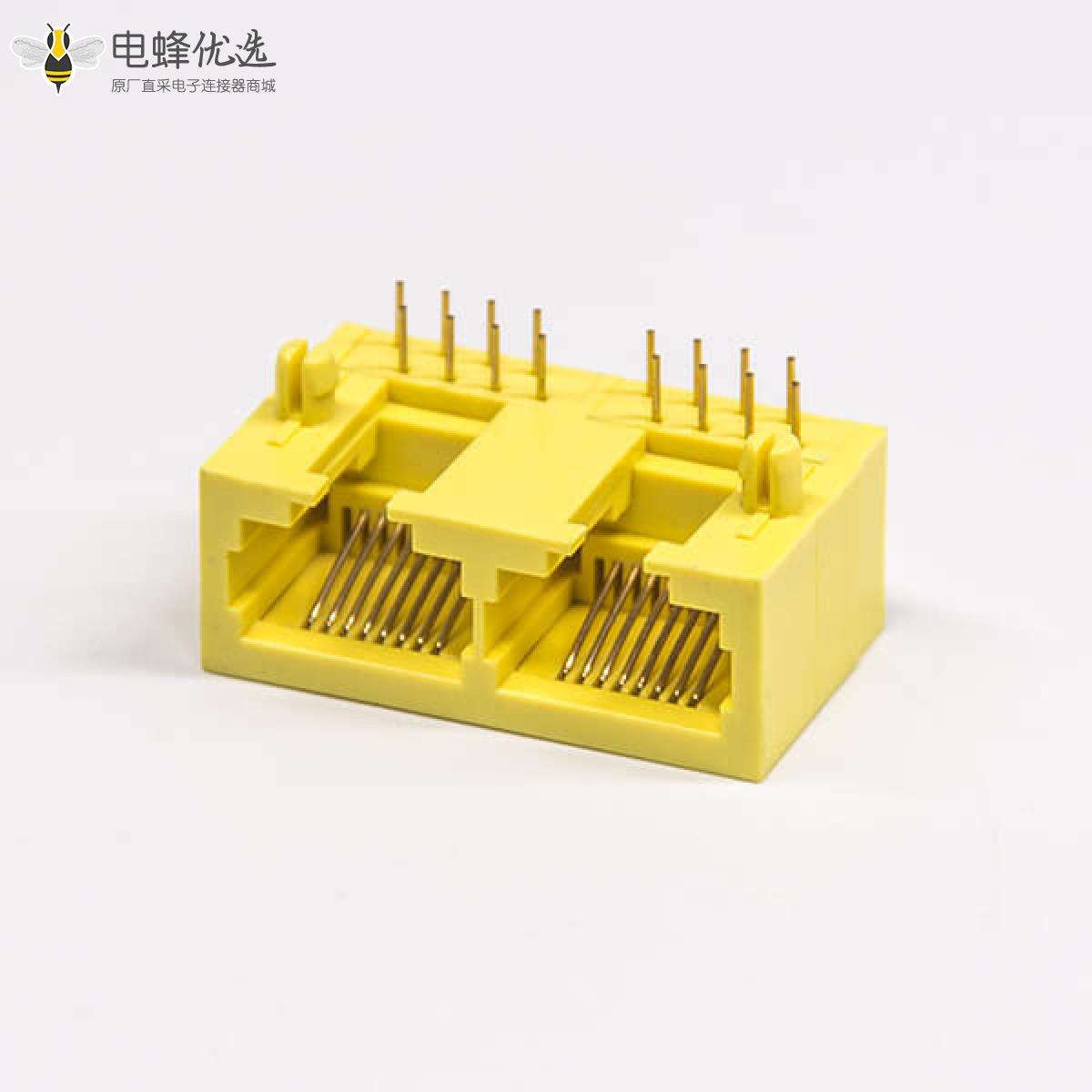 RJ45插座,8P8C,双端口,1*2,弯式90°,触头镀金,插板,PCB板安装,不带屏蔽,不带灯,不带滤波;