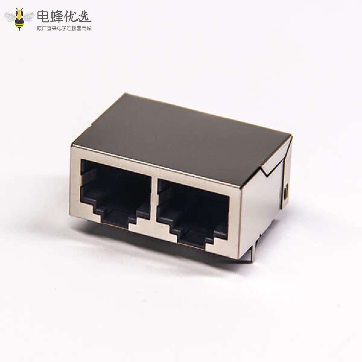 RJ45插座,8P8C,2端口,1*2,弯式90°,触头镀金,插板,PCB板安装,带屏蔽,不带灯,不带滤波;
