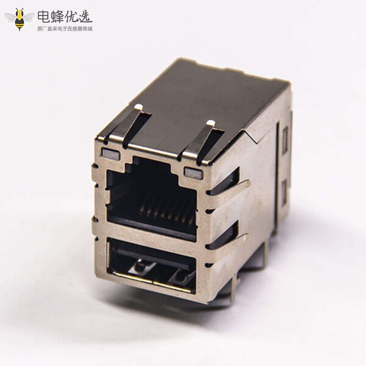 RJ45+Single USB,8P8C,2端口,2*1,弯式90°,触头镀金,插孔,PCB板安装,带屏蔽,带灯,带滤波,带弹片;