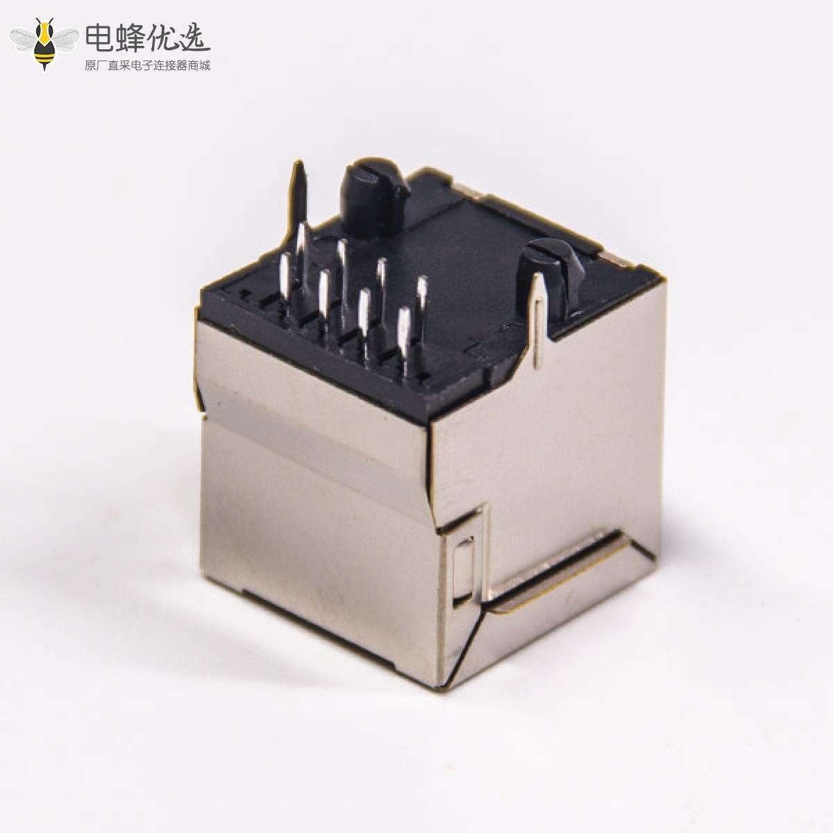 RJ45插座,10P8C,单端口,1*1,弯式90°,触头镀金,插孔,PCB板安装,带屏蔽,不带灯,不带滤波;