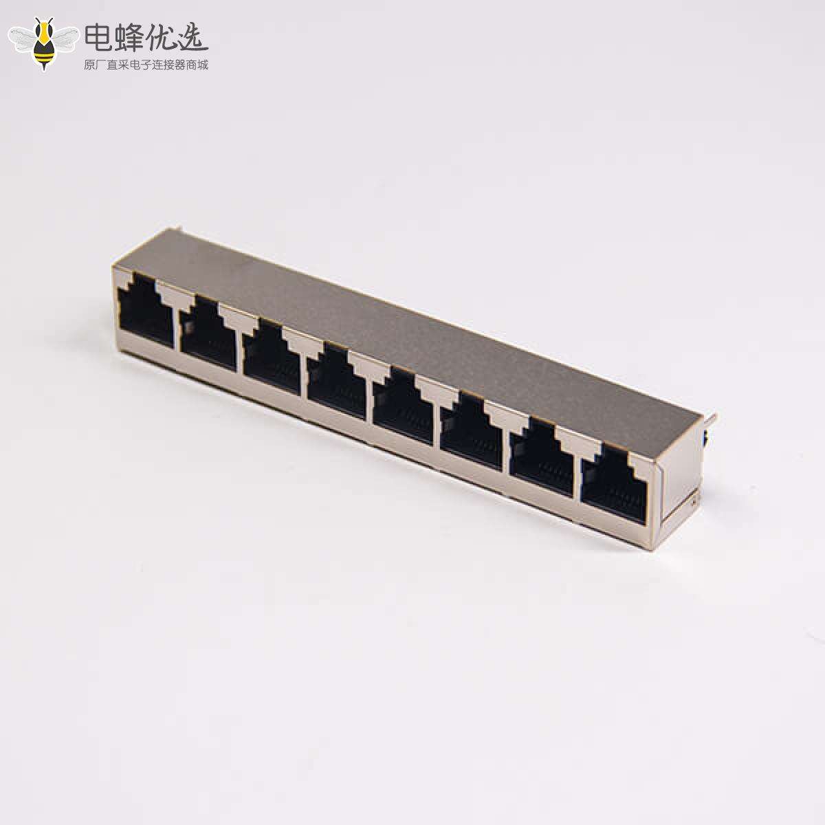 RJ45插座,8P8C,8端口,1*8,直式180°,触头镀金,插孔,PCB板安装,带屏蔽,不带灯,不带滤波;