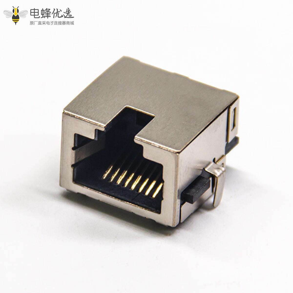RJ45插座,8P8C,单端口,1*1,弯式90°,触头镀金,沉板,插板,带屏蔽,不带灯,不带滤波,带弹片;
