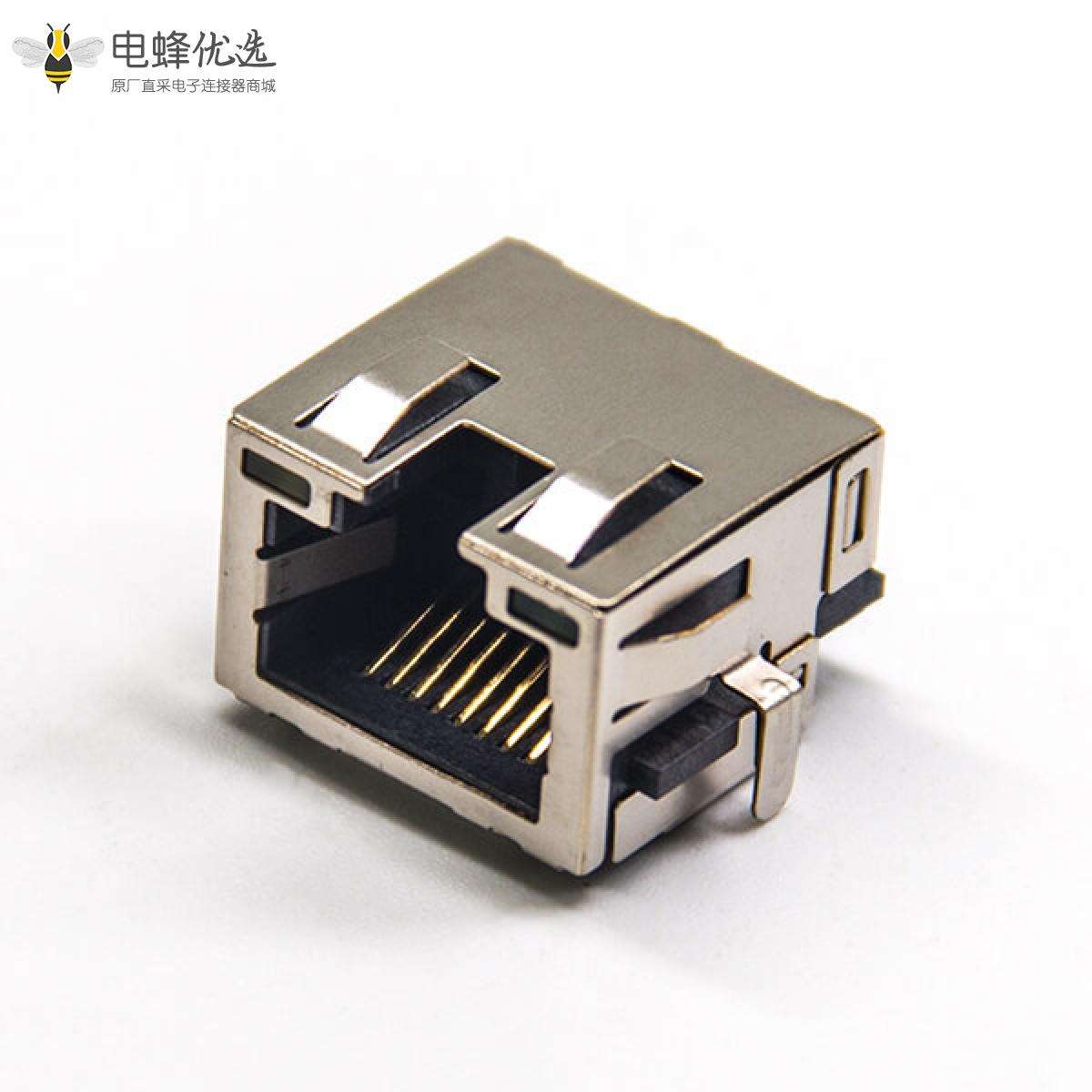 RJ45插座,8P8C,单端口,1*1,弯式90°,触头镀金,沉板,插板,带屏蔽,带灯,不带滤波,带弹片;