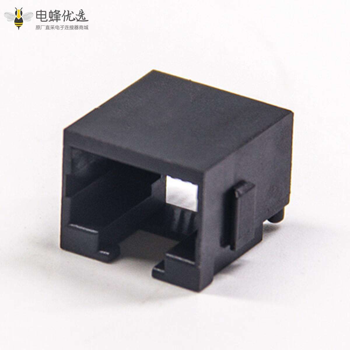 RJ45插座,8p8c,单端口,1*1,弯式90°,触头镀金,沉板贴板,PCB板安装,非屏蔽,不带灯,不带滤波;