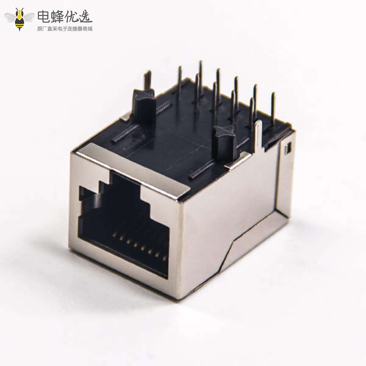 RJ45插座,8p8c,单端口,1*1,弯式90º,触头镀金,插孔,PCB板安装,带屏蔽,不带灯,不带滤波;