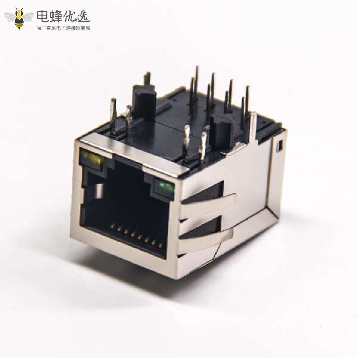 RJ45插座,8p8c,单端口,1*1,弯式90º,触头镀金,插孔,PCB板安装,带屏蔽,带灯,不带滤波;
