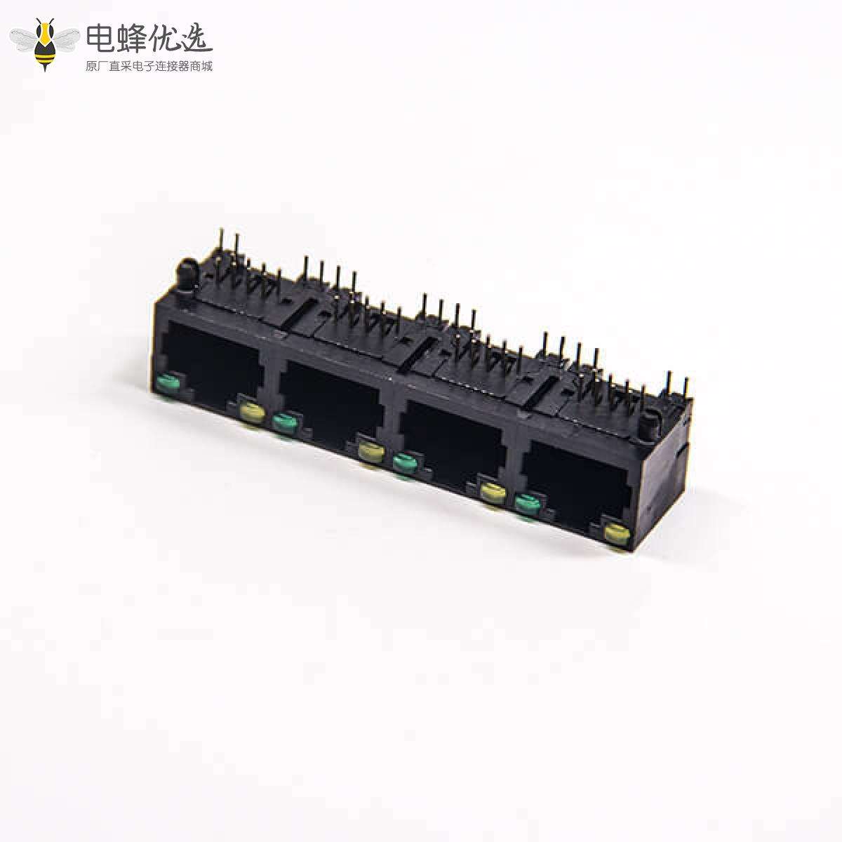 RJ45插座,8p8c,4端口,1*4,弯式90º,触头镀金,插孔,PCB板安装,不带屏蔽,带灯,不带滤波;