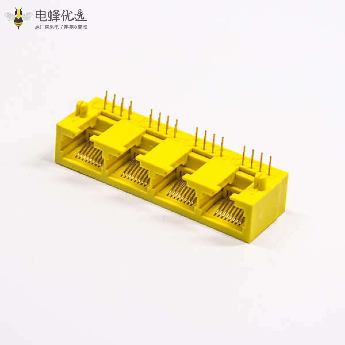 RJ45插座,8p8c,4端口,1*4,弯式90º,触头镀金,插孔,PCB板安装,不带屏蔽,带灯,不带滤波;