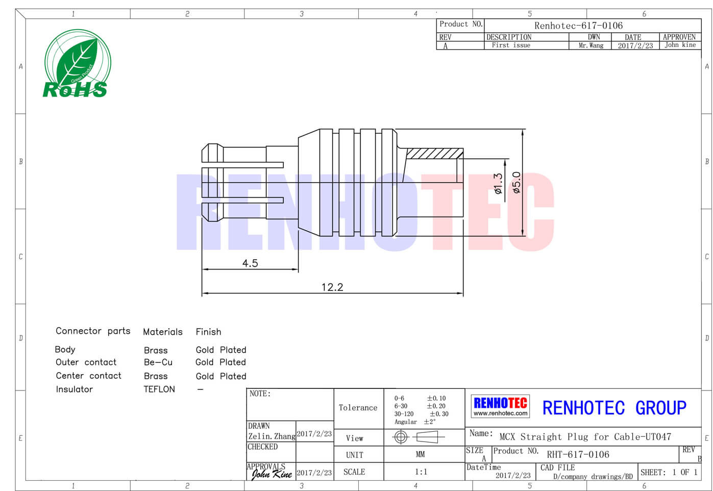 - mcx连接器,同轴线缆,公头,50欧,直式,UT047,焊接
