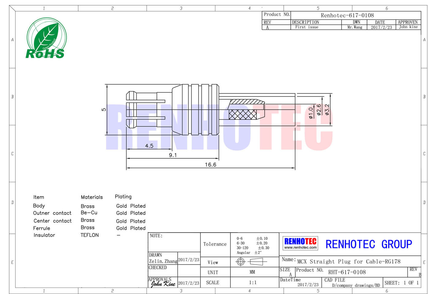 - mcx连接器,同轴线缆,公头,50欧,直式,RG178,压接;