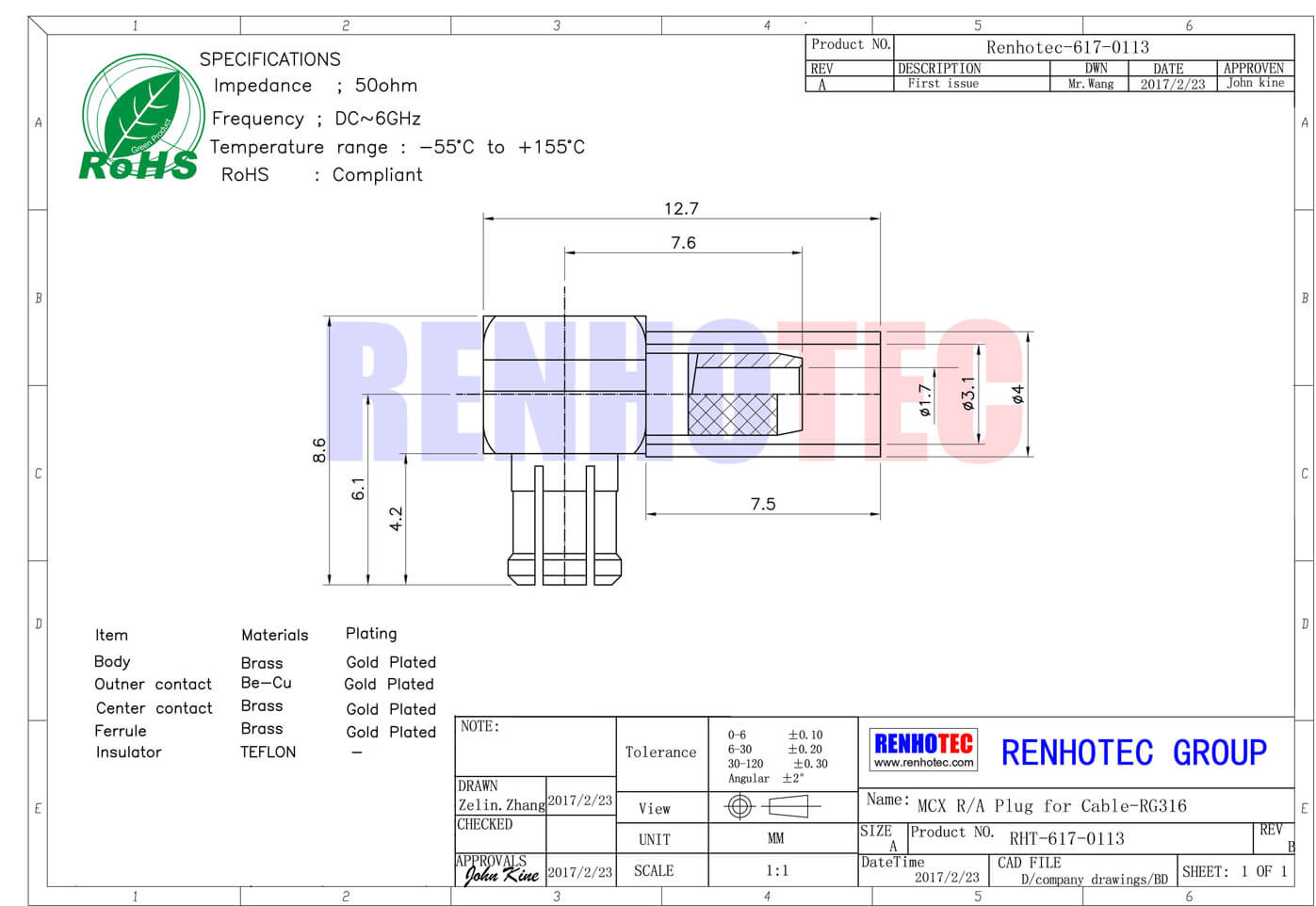 - mcx连接器,同轴线缆,公头,50欧,弯式,RG316,压接;