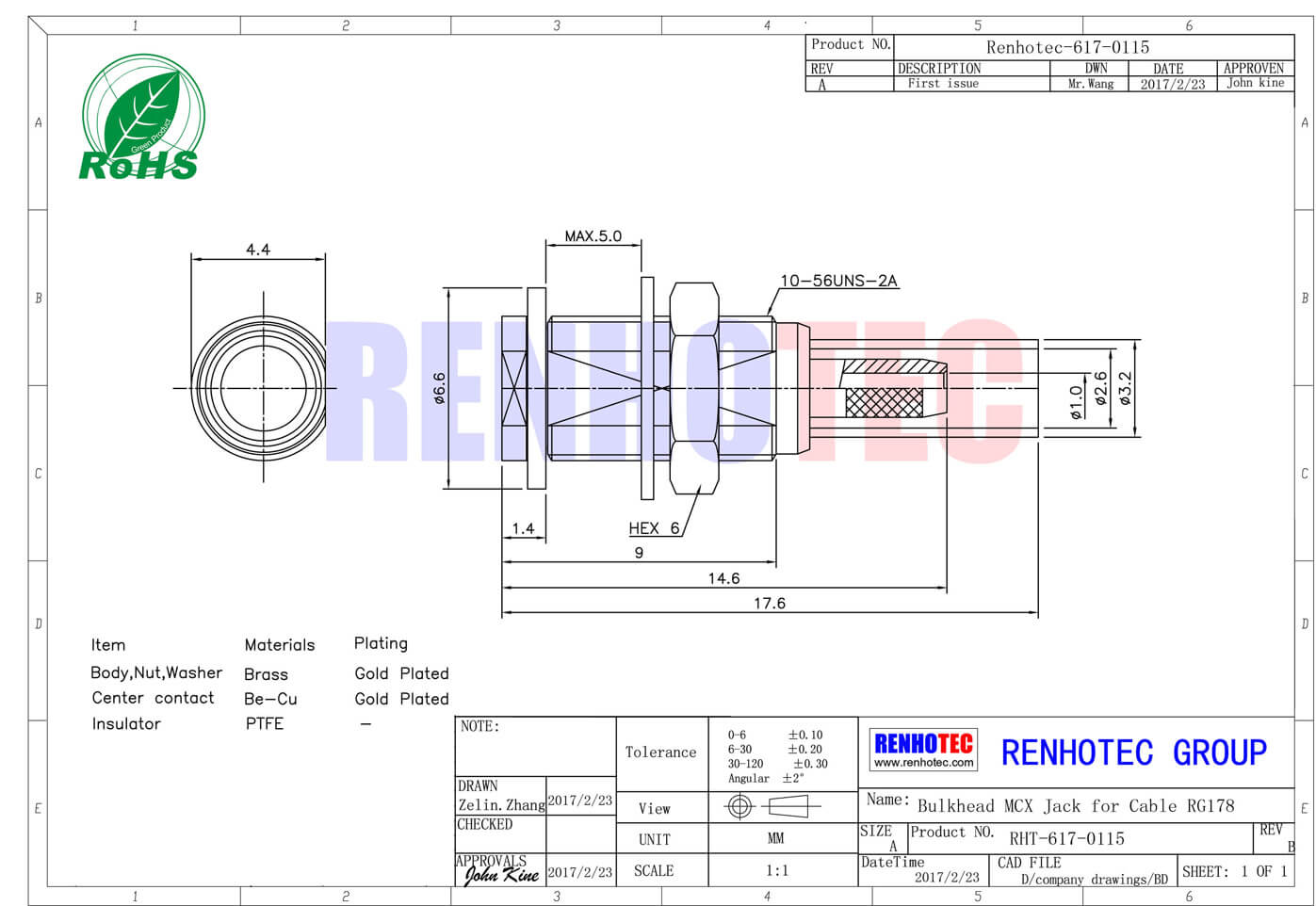- mcx连接器,同轴线缆,母头,50欧,直式,RG178,压接,穿墙;