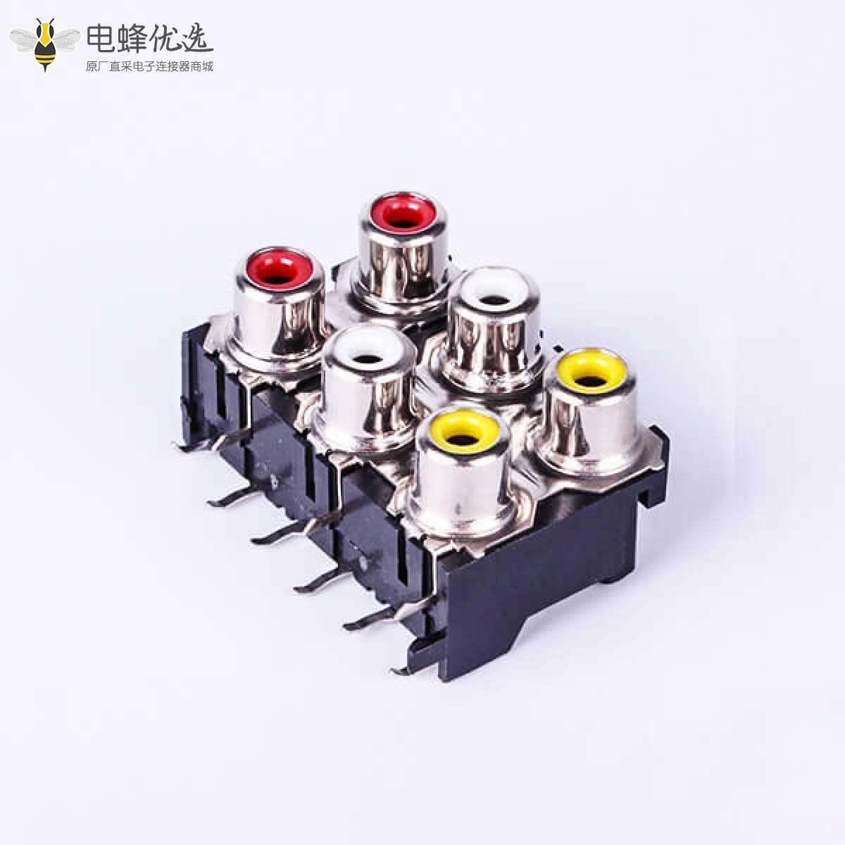 RCA连接器,母,插座,90°弯式,6孔,2*3,接板,插板,黑色塑胶,ABS.PBT,镀镍;