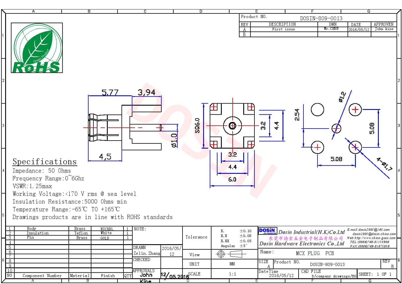 - 中心接触电阻: ≦ 5.0 mΩ (Milliohms max.)